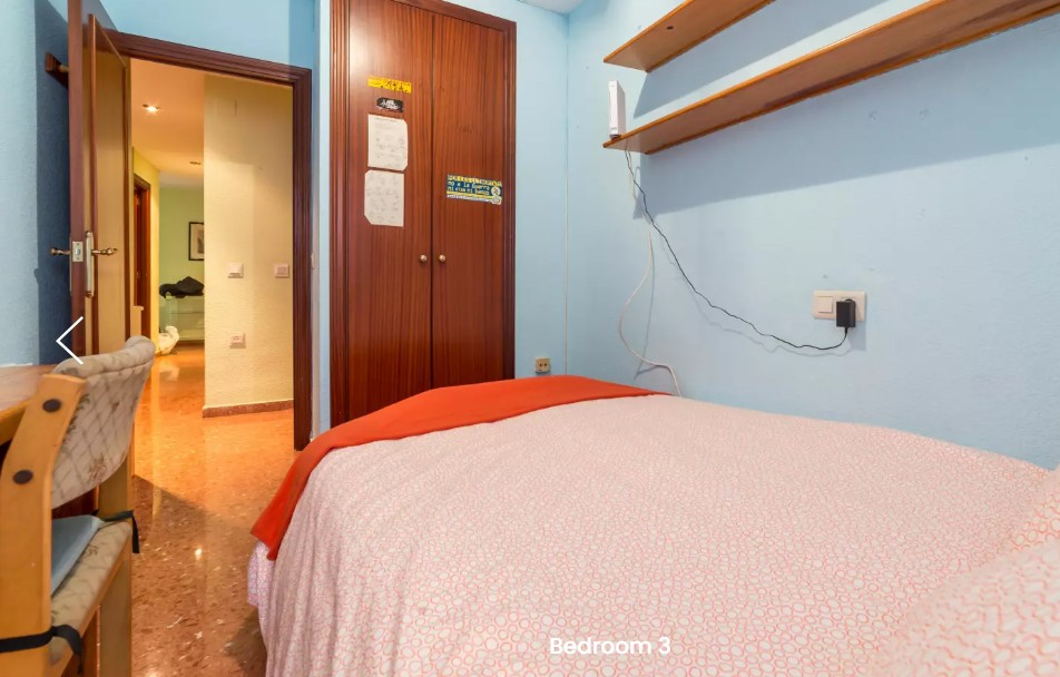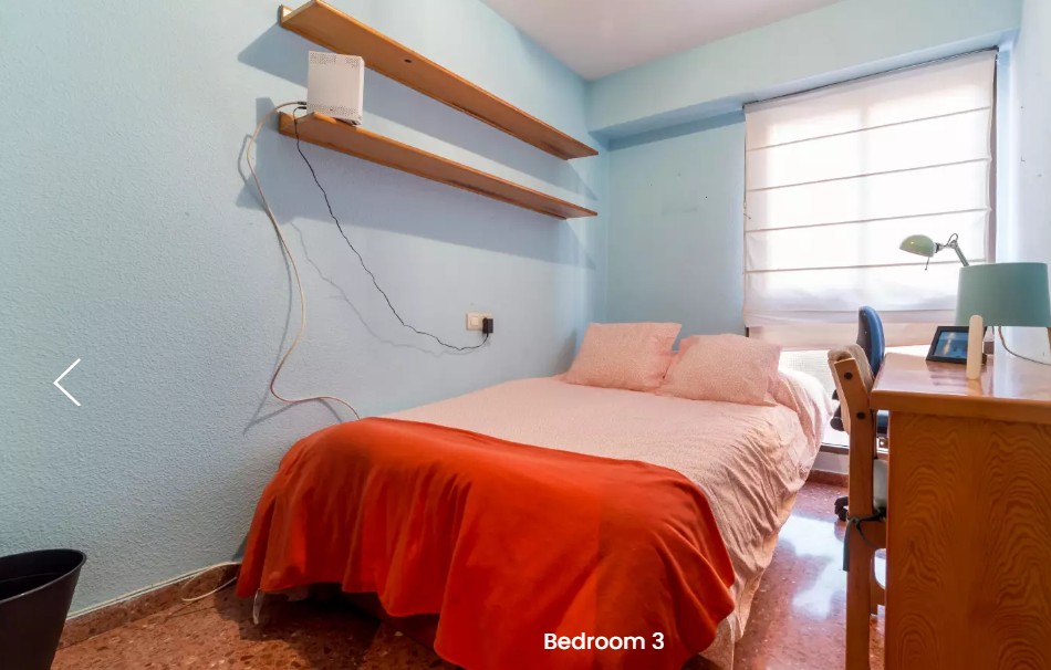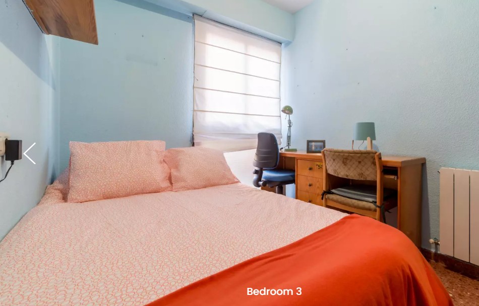 Habitación en alquiler en apartamento de 90 m² y 5 dormitorios en Algirós. completamente amueblada con una cama, escritorio y espacio de almacenamiento. Hay 1 baño completo para compartir entre 4 de las habitaciones y otro con baño privado. La zona común principal es la amplia cocina que viene totalmente equipada y amueblada con una mesa de comedor.